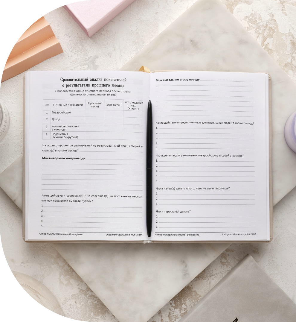 Он заключает в себя авторскую систему планирования, которая звучит так: план – факт – анализ – выводы.
